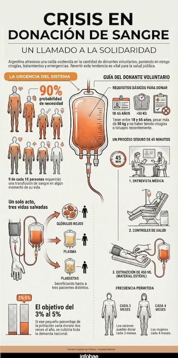 Conluyó Mendez a Infobae: “Lo más alarmante no es sólo la disminución global del número de donantes, sino también la marcada reducción de donantes voluntarios y habituales, los que garantizan la seguridad transfusional. Alguien que es voluntario y dona dos o tres veces al año, da soporte al sistema de salud".