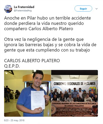 Luego del accidente, el gremio La Fraternidad que agrupa a los conductores de trenes lamentó lo sucedido a través de su cuenta de Twitter: "Otra vez la negligencia de la gente que ignora las barreras bajas y se cobra la vida de gente que está cumpliendo con su trabajo".