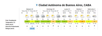 Mañana domingo, las condiciones meteorológicas se mantendrán, aunque se espera un leve aumento del calor. Las nubes persistirán en todo el AMBA, con vientos provenientes del sector norte que irán rotando hacia el suroeste, y temperaturas que oscilarán entre los 10°C de mínima y los 20°C de máxima. Tanto el sábado como el domingo la probabilidad de precipitaciones será nula, informó el organismo dependiente del Ministerio de Defensa.
