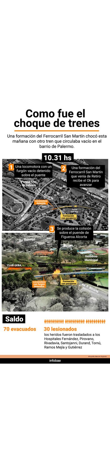 Trenes Argentinos comunica que una formación -con siete coches- de la línea San Martín colisionó con una locomotora y un coche furgón vacío, a las 10.31, en el kilómetro 4,900 - a la altura de la avenida Alcorta- sobre el viaducto Palermo.