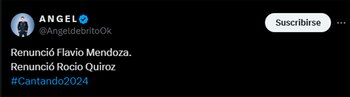 “Renunció Flavio Mendoza. Renunció Rocío Quiroz”, escribió el periodista en la red social, lo que generó una variada repercusión entre sus seguidores. Hasta el momento, ni el coreógrafo -que estaba participando como jurado junto a Nacha Guevara, Marcelo Polino y Millet Figueroa- ni la cantante hicieron declaraciones públicas sobre sus respectivas decisiones.
