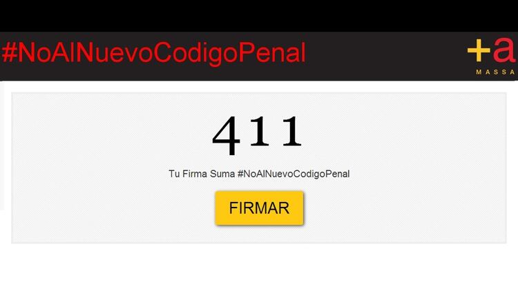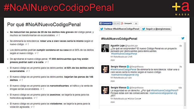 Sergio Massa sumó hoy un elemento más a su campaña contra la reforma del Código Penal. El líder del Frente Renovador habilitó la juntada de firmas en la web www.noalnuevocodigopenal.org contra el anteproyecto elaborado por el juez Eugenio Raúl Zaffaroni y una comisión de expertos de distintos sectores de la oposición.