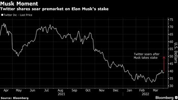 ارتفعت أسهم تويتر حوالي 26٪ في عمليات ما قبل السوق بعد الكشف عن شراء ماسك يوم الاثنين في وثيقة تنظيمية. تبلغ قيمة السهم حوالي 2.89 مليار دولار أمريكي، بناءً على قيمة إغلاق السوق يوم الجمعة.