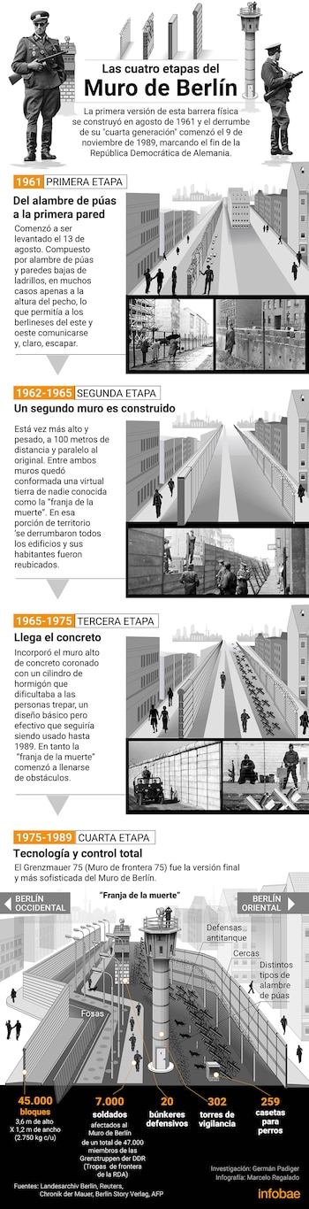 El Muro de Berlín comenzó a ser construido el 13 de agosto de 1961, en un contexto de fuertes tensiones entre Estados Unidos y Rusia y ante el deterioro de las condiciones de vida en la DDR y el flujo incesante de inmigrantes hacia el oeste (calculado en 2,7 millones de personas entre 1945 y 1961). En esta etapa, conocida como “de primera generación”, la sencilla “barrera de protección antifascista”, como fue bautizada por las autoridades comunistas, contaba sólo con alambre de púas y paredes de ladrillo de baja altura.