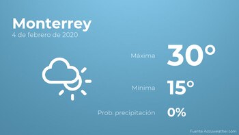 Hoy en Monterrey habrá más nubes que claros. Por lo que respecta a las temperaturas, estas variarán entre los 30 grados de máxima y 15 de mínima. Además, se esperan vientos del norte de carácter débil con cifras de hasta 13 km/h.