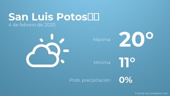 En el día de hoy en San Luis Potosí se prevén nubes y claros. En cuanto a las temperaturas, oscilarán entre una máxima de 20 y una mínima de 11 grados. En general, vientos del suroeste con cifras de hasta 50 km/h.