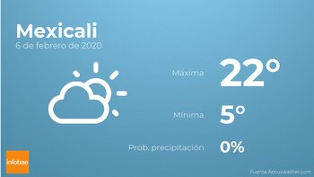 A lo largo del día de hoy en Mexicali habrá pocas nubes. En relación a las temperaturas, estas se moverán entre una máxima de 22 y una mínima de 5 grados. En general, vientos del sureste sin apenas intensidad con cifras de hasta 13 km/h.
