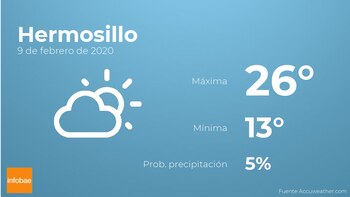 Hoy a primera hora en Hermosillo se prevén nubes y claros. A medida que avance el día habrá nubes y claros con poca probabilidad de precipitaciones. En cuanto a las temperaturas, estas se moverán entre una máxima de 26 y una mínima de 13 grados. Viento sin apenas intensidad con rachas de hasta 24 kilómetros por hora.