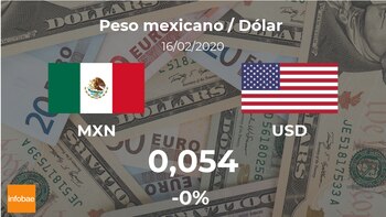 En la foto anual, el Peso mexicano / Dólar (MXN/USD) ha llegado a pagarse en un máximo de 0,054 dólares, mientras que su nivel más bajo ha sido 0,053 dólares. El Peso mexicano / Dólar (MXN/USD) se sitúa más cerca de su máximo que de su mínimo.