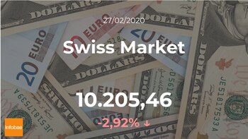 Sesión adversa para el selectivo, que acabó la sesión del jueves 27 de febrero con fuertes caídas del 2,92%, hasta los 10.205,46 puntos. El Swiss Market llegó a un volumen máximo de 10.461,17 puntos y la cifra mínima de 10.094,92 puntos. El rango de cotización para el índice entre su punto más alto y el más bajo (máximo-mínimo) durante este día se situó en el 3,5%.