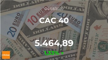Positiva sesión para el índice, que acabó la jornada del miércoles 4 de marzo con notables incrementos del 1,33%, hasta los 5.464,89 puntos. El selectivo llegó a un volumen máximo de 5.493,25 puntos y la cifra mínima de 5.357,35 puntos. El rango de cotización para el CAC 40 entre su punto más alto y el más bajo (máximo-mínimo) durante este día se situó en el 2,47%.