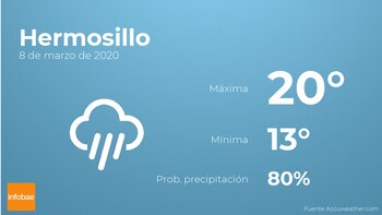 En la mañana de hoy en Hermosillo habrá cielos cubiertos con lloviznas generalizadas. Por la tarde se prevén más nubes que claros con escasa probabilidad de precipitaciones. En cuanto a las temperaturas, oscilarán entre una máxima de 20 y una mínima de 13 grados centígrados. En general, vientos de carácter flojo con valores de hasta 15 kilómetros por hora.