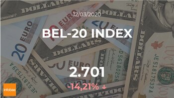 Día negativo para el selectivo, que acabó la jornada del jueves 12 de marzo con fuertes descensos del 14,21%, hasta los 2.701 puntos. El índice anotó un máximo de 3.030,35 puntos y la cifra mínima de 2.697,94 puntos. El rango de cotización para el BEL-20 INDEX entre su punto más alto y el más bajo (máximo-mínimo) durante este día se situó en el 10,97%.