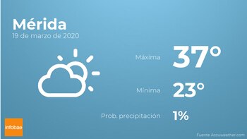Hoy a primera hora en Mérida habrá nubes escasas. Según pasen las horas tendremos pocas nubes con baja probabilidad de que haya precipitaciones. En relación a las temperaturas, estas oscilarán entre una máxima de 37 y una mínima de 23 grados centígrados. Viento de carácter débil con cifras de hasta 28 kilómetros por hora.