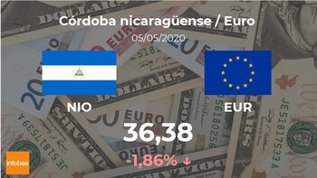 El euro se paga a las 14:46 horas a 36,38 córdobas nicaragüenses, lo cual supuso una disminución del 1,86% frente a los 37,07 córdobas nicaragüenses de la jornada previa.