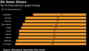 La sombría proyección subraya el dolor generalizado para los restaurantes estadounidenses, ya que los cierres han forzado a las personas a cocinar en casa o pedir comida para llevar en lugar de comer fuera. Las reservas totales y los clientes sin cita previa de la red de OpenTable cayeron un 95% el 13 de mayo con respecto al mismo día del año anterior, según los datos del servicio, propiedad de Booking Holdings Inc.