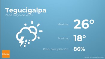 Para las primeras horas del día en Tegucigalpa habrá nubes y claros con tormentas acompañadas de lluvia. A medida que avance el día se esperan cielos cubiertos con probabilidad de tormentas acompañadas de lluvia. En cuanto a las temperaturas, oscilarán entre una máxima de 26 y una mínima de 18 grados centígrados. Además, se esperan vientos de carácter flojo con rachas de hasta 15 km/h.