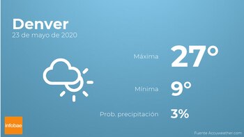 Hoy a primera hora en Denver habrá más nubes que claros. A medida que avance el día el cielo estará cubierto con probabilidad de alguna llovizna. En relación a las temperaturas, estas se moverán entre una máxima de 27 y una mínima de 9 grados. Viento de carácter flojo con rachas de hasta 20 kilómetros por hora.