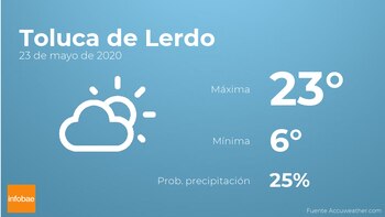 En la mañana de hoy en Toluca de Lerdo tendremos escasa nubosidad con poca probabilidad de lluvias. Por la tarde se esperan nubes y claros con baja probabilidad de que haya precipitaciones. Con respecto a las temperaturas, oscilarán entre una máxima de 23 y una mínima de 6 grados centígrados. En general, vientos del oeste de poca intensidad con rachas de hasta 18 km/h.