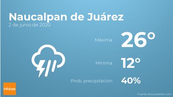 Durante las primeras horas del día en Naucalpan de Juárez el cielo estará cubierto con probabilidad de tormentas y lluvia. Por la tarde habrá nubes y claros con probabilidad de tormentas acompañadas de lluvia. Por lo que respecta a las temperaturas, estas variarán entre una máxima de 26 y una mínima de 12 grados. Además, se esperan vientos de poca intensidad con rachas de hasta 24 km/h.