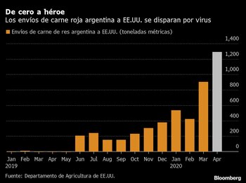 Los envíos comenzaron a fluir en la segunda mitad de 2019, pero aumentaron en abril en medio del atasco de procesamiento en Estados Unidos. Si bien las plantas de EE.UU. han reabierto, aún no han vuelto a su capacidad total. Argentina representa solo el 1% del total de las importaciones estadounidenses.