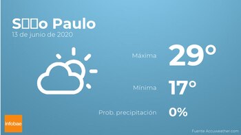 A lo largo de la mañana en São Paulo tendremos nubes escasas. A medida que avance el día se prevén más nubes que claros. Con respecto a las temperaturas, variarán entre una máxima de 29 y una mínima de 17 grados centígrados. Viento del noroeste de carácter débil con rachas de hasta 18 km/h.