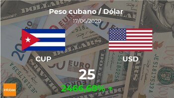 El dólar estadounidense se negocia a las 13:00 horas a 25 pesos cubanos, lo que implicó un incremento del 2466,68% comparado con los 0,97 pesos cubanos del día anterior.