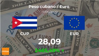 El euro se paga a las 13:00 horas a 28,09 pesos cubanos, de modo que supuso una subida del 2465,49% si se compara con los 1,09 pesos cubanos de la jornada anterior.
