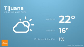 Durante la mañana en Tijuana se prevén nubes y claros. Por la tarde habrá más nubes que claros. En cuanto a las temperaturas, estas se moverán entre una máxima de 22 y una mínima de 16 grados. En general, vientos sin apenas intensidad con cifras de hasta 18 kilómetros por hora.