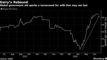 El panorama era relativamente sombrío hasta que los Gobiernos intervinieron. Estados Unidos prometió US$2.900 millones en su rescate a los productos lácteos. La Unión Europea prometió 30 millones de euros (US$34 millones), y Australia también ha destinado fondos para la industria. Eso hizo que los futuros de la leche en Chicago se dispararan después de tocar un mínimo de diez años en abril.