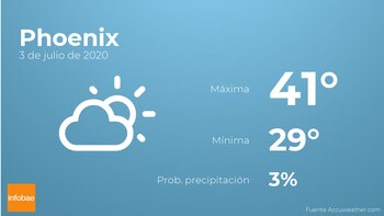 Para hoy en Phoenix habrá nubes escasas. En cuanto a las temperaturas, variarán entre una máxima de 41 y una mínima de 29 grados centígrados. En general, vientos del oeste de poca intensidad con rachas de hasta 17 kilómetros por hora.