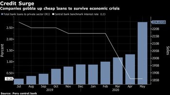 Las empresas están aprovechando las bajas tasas de interés para resistir una caída de la demanda. Un programa para proporcionar a las empresas 60.000 millones de soles (US$17.100 millones) en préstamos baratos ha reducido las tasas de los bancos comerciales. El banco central inició la semana pasada una segunda fase que Velarde ha llamado indispensable para la recuperación de la economía.