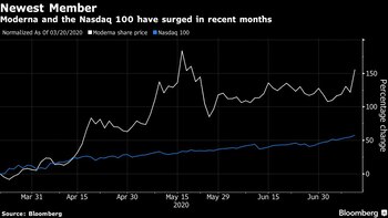 (Bloomberg) -- Moderna Inc. ha sido nombrada como la próxima miembro del Nasdaq-100, un índice con un gran componente tecnológico conformado por algunas de las acciones con el mejor desempeño este año, como Tesla Inc. y Zoom Video Communications Inc.