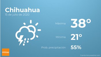 Para las primeras horas del día en Chihuahua habrá nubes y claros con probabilidad de tormentas y lluvia. A medida que avance el día se esperan nubes y claros. En cuanto a las temperaturas, estas se moverán entre los 38 grados de máxima y 21 de mínima. Además, se esperan vientos del noreste de carácter débil con cifras de hasta 18 km/h.
