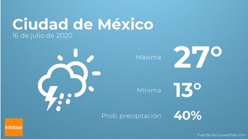 Hoy por la mañana en Ciudad de México se esperan nubes y claros con probabilidad de tormentas acompañadas de lluvia. Según pasen las horas tendremos más nubes que claros con poca probabilidad de lluvias. Con respecto a las temperaturas, oscilarán entre una máxima de 27 y una mínima de 13 grados. En general, vientos del noreste de carácter flojo con valores de hasta 32 km/h.