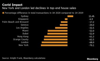 Solo 41 propiedades se vendieron por US$10 millones o más en la capital financiera de EE.UU., frente a 137 un año antes, debido a que la pandemia de coronavirus provocó el cierre de fronteras y trastornó los acuerdos, según la firma inmobiliaria Knight Frank. La caída superó el desplome del 68% en Londres y del 61% en Hong Kong.