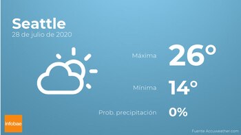 A lo largo del día de hoy en Seattle habrá nubes y claros. Las temperaturas oscilarán entre una máxima de 26 y una mínima de 14 grados centígrados. Además, se esperan vientos sin apenas intensidad con valores de hasta 15 kilómetros por hora.