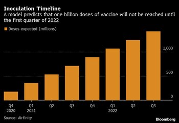 Algunos favoritos, como Oxford University y su socio AstraZeneca Plc y una colaboración Pfizer-BioNTech SE, ya están en estudios de etapa final, alimentando esperanzas de que pronto habrá un arma para luchar contra el covid. Pero los desarrolladores aún deben superar una serie de obstáculos: demostrar que sus vacunas son efectivas, obtener la aprobación y aumentar la fabricación. La oferta mundial podría alcanzar los 1.000 millones de dosis hasta el primer trimestre de 2022, pronostica Airfinity.