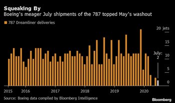 Las entregas en julio totalizaron solo cuatro aviones comerciales, incluidos dos cargueros y dos 787 Dreamliners. Fue el peor mes para el Dreamliner desde mediados de 2013, excepto en mayo de este año, cuando Boeing no entregó ninguno, según cifras compiladas por Bloomberg Intelligence.