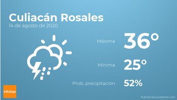 Hoy a primera hora en Culiacán Rosales se prevén nubes y claros con probabilidad de tormentas y lluvia. Según pasen las horas tendremos nubes y claros con poca probabilidad de lluvias. Las temperaturas oscilarán entre una máxima de 36 y una mínima de 25 grados. Además, se esperan vientos de poca intensidad con rachas de hasta 13 km/h.