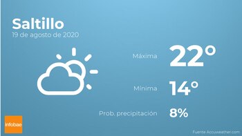 Hoy a primera hora en Saltillo tendremos nubes y claros. Por la tarde habrá nubes escasas. Las temperaturas oscilarán entre una máxima de 22 y una mínima de 14 grados centígrados. En general, vientos del noreste sin apenas intensidad con rachas de hasta 15 kilómetros por hora.