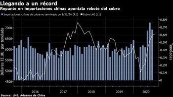 (Bloomberg) -- China compró enormes volúmenes de cobre en agosto, con importaciones no muy lejanas al récord de julio. El aumento de la demanda del principal usuario del mundo ha sido uno de los principales impulsores del reciente repunte del cobre, con precios que se negocian cerca de un máximo de dos años. Operadores y analistas ven mayores ganancias en el futuro, a medida que el voraz apetito de China por el metal deja el resto de los inventarios del mundo en niveles bajos.