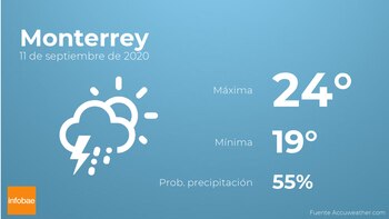 Hoy en Monterrey se prevén nubes y claros con probabilidad de tormentas acompañadas de lluvia. Las temperaturas estarán entre una máxima de 24 y una mínima de 19 grados centígrados. Junto a todo esto, se esperan vientos de poca intensidad con cifras de hasta 11 kilómetros por hora.