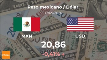 En la última jornada el dólar estadounidense se negoció a las 22:00 horas a 20,86 pesos mexicanos, de modo que supuso un descenso del 0,41% si se compara con los 20,94 pesos mexicanos de la jornada anterior.