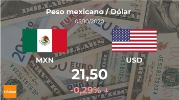 El dólar estadounidense se cotiza a las 12:01 horas a 21,50 pesos mexicanos, lo que implicó una bajada del 0,29% si se compara con los 21,56 pesos mexicanos de la jornada previa.