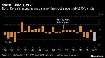 Este año, Corea del Norte se dirige hacia su mayor contracción económica desde 1997, según Fitch Solutions, debido a que el coronavirus provocó el cierre de las fronteras y las inundaciones destruyeron grandes franjas de cultivos. Kim emitió una inusual advertencia para la economía de Corea del Norte en agosto, diciendo a los líderes del partido que su país se enfrentaba a desafíos inesperados e inevitables en varios aspectos, y agregó que sus objetivos de desarrollo se habían “retrasado seriamente”.