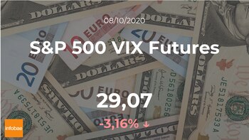 Día negativo para el S&P 500 VIX Futures, que acabó la sesión del jueves 8 de octubre con ligeras descensos del 3,16%, hasta los 29,07 puntos. El S&P 500 VIX Futures marcó un volumen máximo de 30,12 puntos y la cifra mínima de 29,07 puntos. El rango de cotización para el S&P 500 VIX Futures entre su punto más alto y el más bajo (máximo-mínimo) durante este día se situó en el 3,49%.