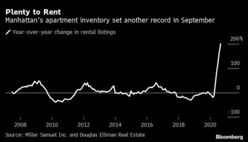 Las concesiones se ofrecieron en un récord de 55% del total de los nuevos arrendamientos de Manhattan firmados en septiembre, según el informe. Tomando encuentra todos los beneficios y concesiones, la renta media cayó 11% a US$3.036. Eso es lo más bajo que se ha registrado desde julio de 2013.