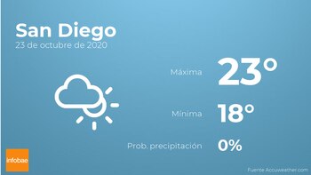 Durante el día de hoy en San Diego habrá más nubes que claros. Con respecto a las temperaturas, variarán entre una máxima de 23 y una mínima de 18 grados centígrados. En general, vientos de carácter débil con rachas de hasta 17 km/h.