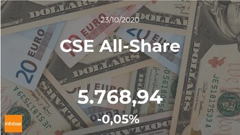 Jornada continuista para el CSE All-Share, que terminó el día del viernes 23 de octubre con una leve subida del 0,05%, hasta los 5.768,94 puntos. El CSE All-Share marcó un volumen máximo de 5.862,56 puntos y un mínimo de 5.768,94 puntos. El rango de cotización para el CSE All-Share entre su punto más alto y el más bajo (máximo-mínimo) durante este día se situó en el 1,6%.